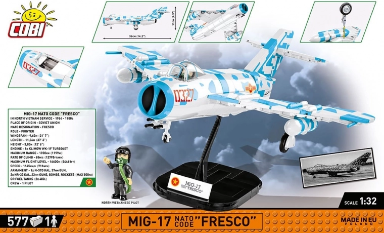 Ovaj realistični set donosi slavni lovac MIG‑17 (u Poljskoj proizvođen kao LIM‑5), koji je služio u zračnim snagama više od 40 zemalja. Atraktivna kamuflaža nadahnuta muzejskim eksponatom s nosača zrakoplova USS Intrepid istaknut će se u svakoj kolekciji zrakoplovstva, Hladnog rata ili Vijetnamskog rata.