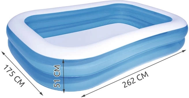 SPECIFIKACIJA- šifra proizvoda Bestway: 54006; materijal: vinil; izvedba: 2 ista prstena / široke bočne stijenke / ispusni ventil za pražnjenje; dob: od 6 godina; kapacitet: 778 litara; dimenzije (duljina / širina / visina): 262x175x51 cm; masa: 4,5 kg