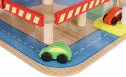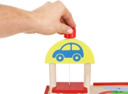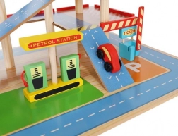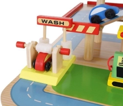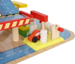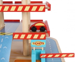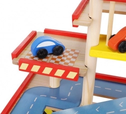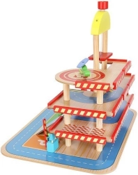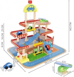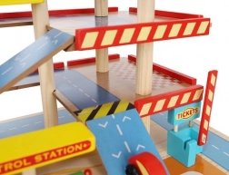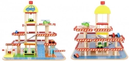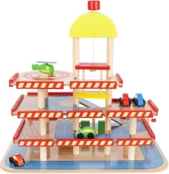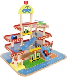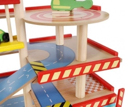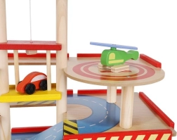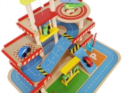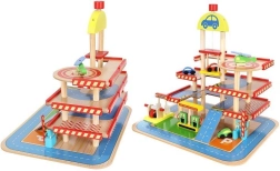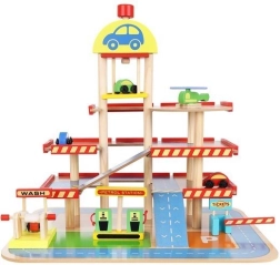 Šareno drveno parkiralište s više razina donosi djeci sate zabave te razvija finu motoriku i maštu. U kompletu su autopraonica, benzinska postaja, blagajna, dizalo, heliodrom i vozila. Stabilna konstrukcija od sigurnog drva i realistični dodaci potiču kreativnu igru i učenje prometnih situacija.