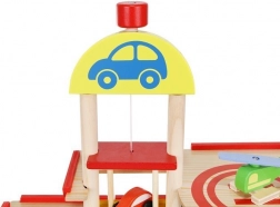 Otkrijte robusno drveno parkiralište s garažom koje nudi tri razine igre povezane rampama, funkcionalno dizalo i gornji heliodrom. Djeca će uživati u realističnim elementima poput autopraonice, benzinske postaje i prodaje karata, koji stvaraju autentične prometne scenarije.