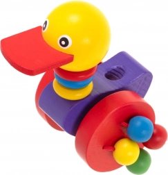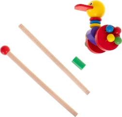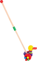 Ova šarena drvena patkica je idealna pratiteljica za šetnje. Dizajnirana je kako bi poticala dječju motoriku i kretanje. Zahvaljujući lako upravljivom drvenom štapu, patkica može biti vođena ili se s njom djeca mogu samostalno igrati.