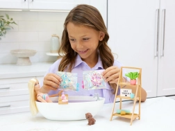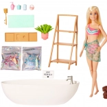 Ovaj kupaonski set donosi djeci od 3 godine šarenu, mirisnu i opuštajuću zabavu. Lutka Barbie u kupaćem kostimu s prozirnim pareom ima 7 točaka savijanja za prirodno poziranje. Dvije ponovno zatvorive vrećice konfeta u ružičastoj i plavoj boji pretvaraju vodu u kadi, a miješanjem stvaraju ljubičastu kupku.
