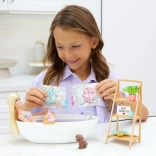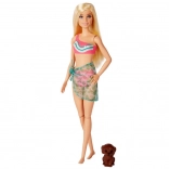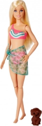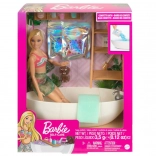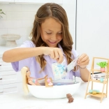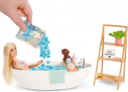 Barbie sa 7 točaka savijanja u šarenom kupaćem kostimu i pareu može udobno uživati u kadi. Tu je i psić za dodatne priče.
