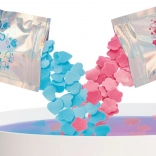 Dvije ponovno zatvorive vrećice otopljenih konfeta u ružičastoj i plavoj boji mijenjaju nijansu vode – pomiješajte ih i stvorite ljubičastu kupku za još više zabave.