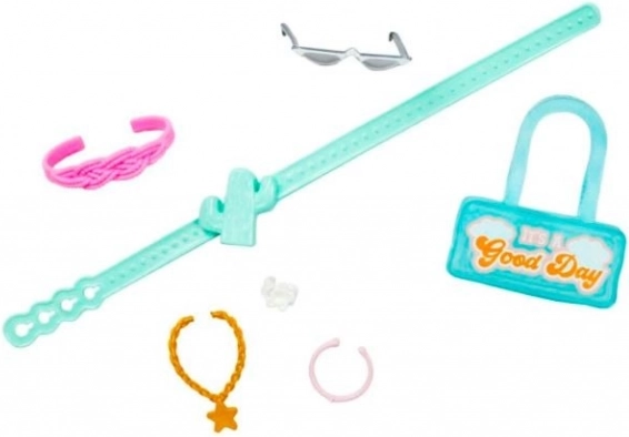Dio seta je niz šarenih dodataka – sunčane naočale s polulećama, ružičasta traka za kosu, ogrlica sa zvijezdom, narukvica, remen s motivom kaktusa i torbica s retro grafikom „Good Day”. Lutka ne stoji samostalno. Boje i detalji mogu se razlikovati.