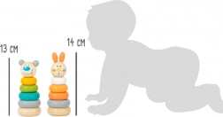 Bezvremenska drvena igračka koja raste s vašim djetetom. Djeca razvrstavaju i nabadaju prstene na štapić, slažu ih prema veličini i otkrivaju boje. Figurice zeka i medvjeda motiviraju na igru i ujedno krase dječju sobu svojim nježno pastelnim izgledom.