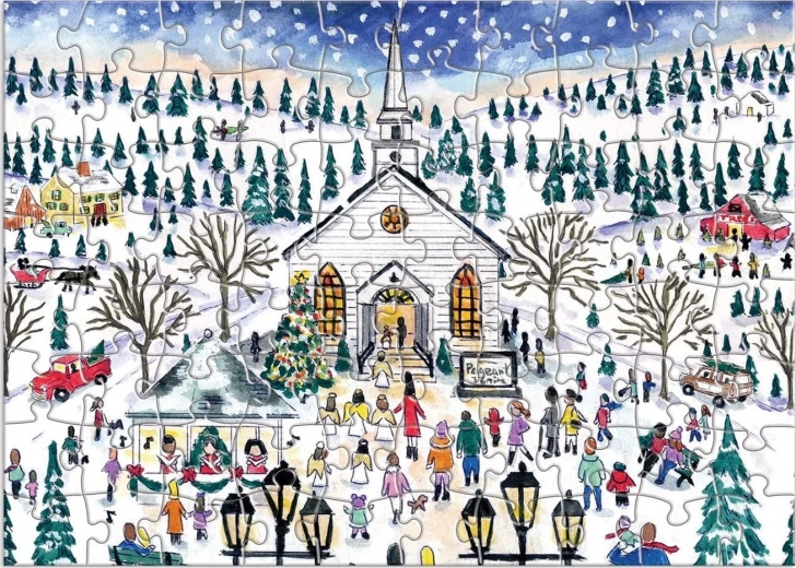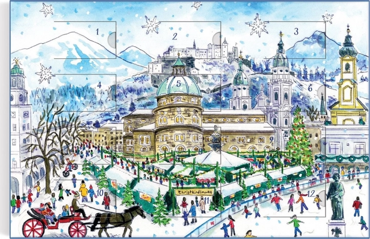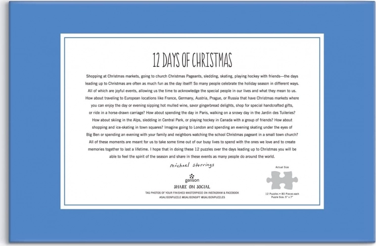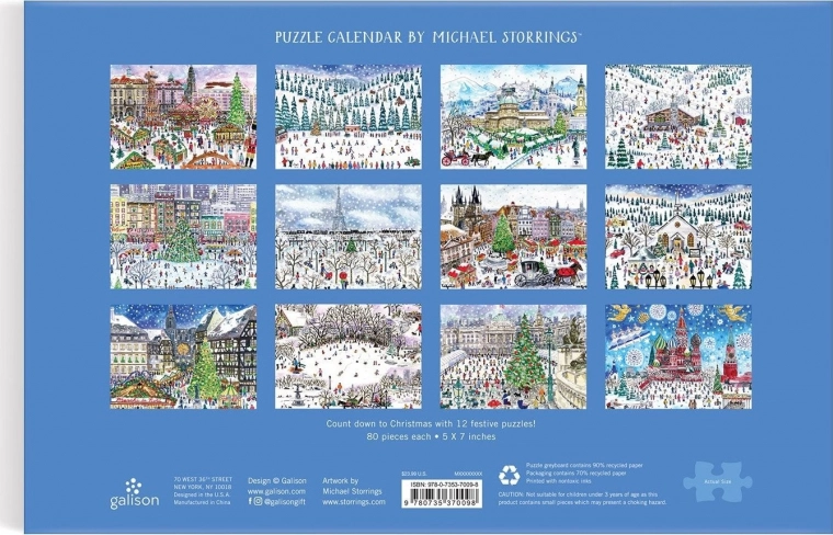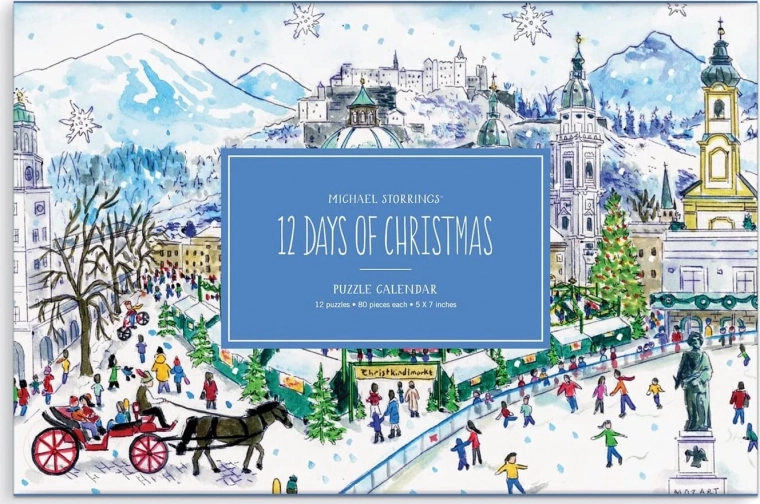 Ovaj originalni adventski kalendar spaja blagdansku dekoraciju s opuštajućom zabavom za male i velike. Nakon izvlačenja vanjske omotnice pojavljuje se unutarnja ploča s 12 prozorčića iza kojih se kriju ilustrirane puzzle. Svaki motiv hvata duh Božića diljem svijeta rukopisom Michaela Storringsa.