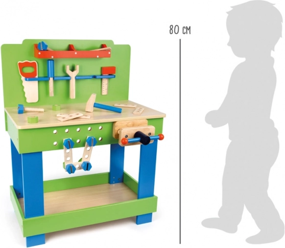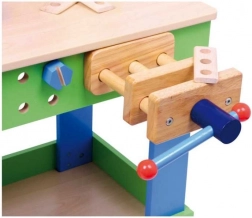Radni stol je čvrsto pričvršćen i sadrži vijčanu stezaljku za osiguranje obradaka. Djeca mogu vježbati vještine poput zakucavanja, vijčenja, mjerenja i rezanja.