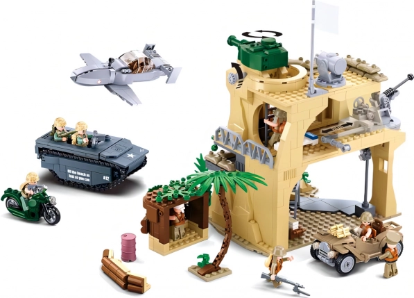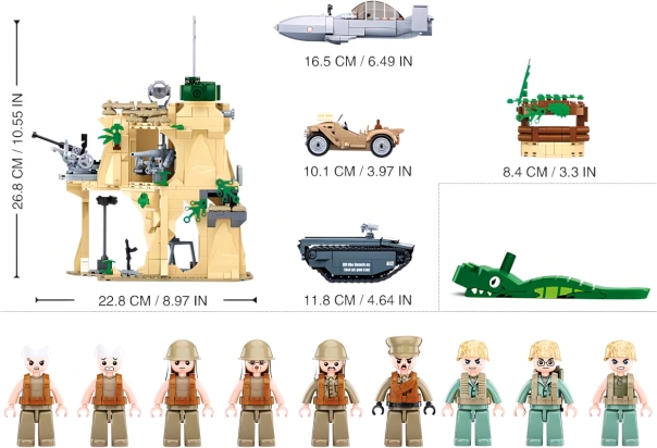 Izgradite vlastitu vojnu bazu i ponovno proživite legendaran sukob s 1027 dijelova i 9 figurica. Ovaj detaljan SLUBAN set nudi tvrđavu sa skrovištima, vojni džip, lovac, vozilo na gusjenicama i motor. Dijelovi od izdržljive ABS plastike su kompatibilni s LEGO, COBI i MEGA BLOKS te oduševljavaju kvalitetom izrade i izvrsnom igrivošću.