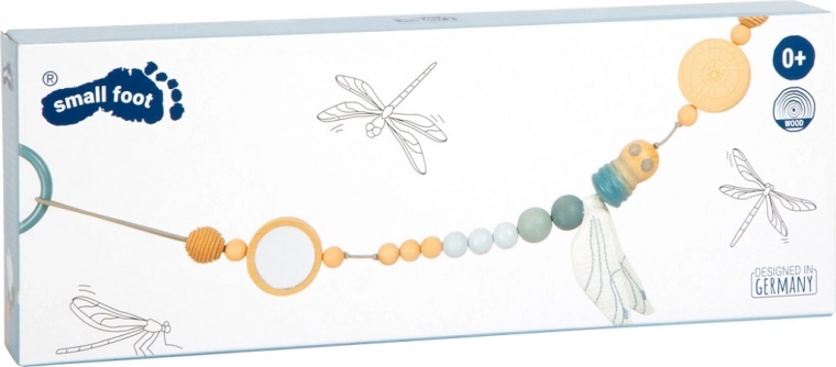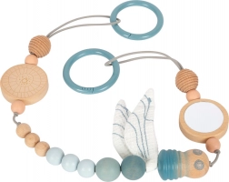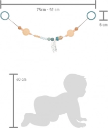Ovaj dizajnerski lančić za kolica SMALL FOOT u prirodnom stilu ističe se kombinacijom drvenih kuglica različitih veličina, nježnih pastelnih tonova i tekstilnih elemenata. Zahvaljujući elastičnoj vrpci prilagođava se raznim tipovima kolica i rukohvata, a pomoću pritisnih točaka na pričvrsnim prstenovima pouzdano ostaje na mjestu. Tekstilno vreteno sa šuškavim krilima potiče osjetilnu percepciju i finu motoriku bebe.