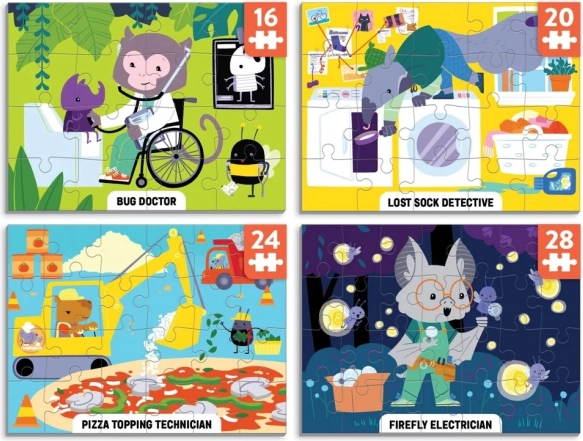 Sa setom Mudpuppy Level Up! čudesna zanimanja – dječje puzzle 4u1 djeca uživaju u slagalicama s postupnim povećanjem težine: 16, 20, 24 i 28 dijelova. Svaka slika ilustratorice Eloise Narrigan otkriva maštovite profesije koje potiču imaginaciju i finu motoriku.