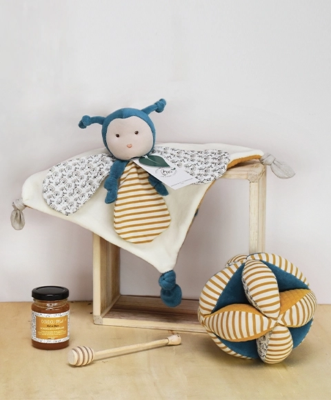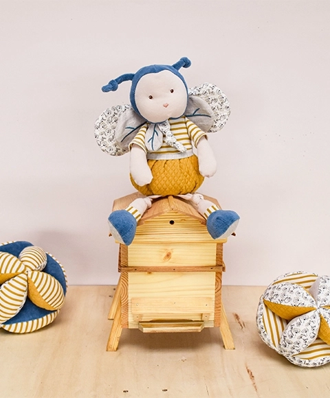 Tekstilna aktivna loptica Pčelica savršena je igračka za malu djecu. Njezina meka tekstura privlači djecu i potiče taktilnu stimulaciju i lako hvatanje. Ova loptica sadrži ugrađeni zvečkajući umetak koji privlači pažnju i doprinosi razvoju sluha.