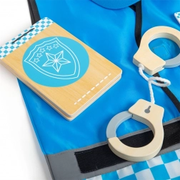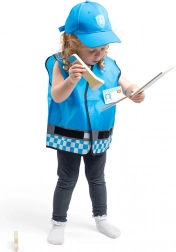 Dječji kostim policajca BIGJIGS TOYS potiče maštu i igru uloga. Plavi prsluk s reflektirajućim detaljima, čičak-zatvaračima i elementima policijske opreme, dopunjen podesivom pamučnom kapom i drvenim dodacima, stvara realističan doživljaj policijskog zanimanja.