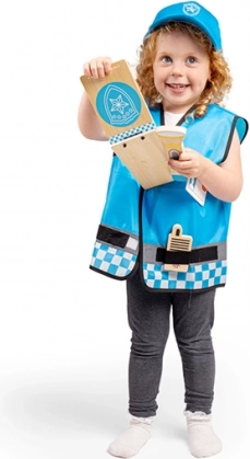 Plavi prsluk s reflektirajućim detaljima i kapa s amblemom stvaraju autentičan izgled policajca te potiču socijalne i komunikacijske vještine.