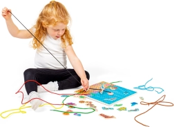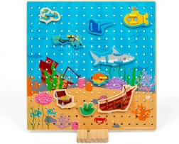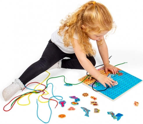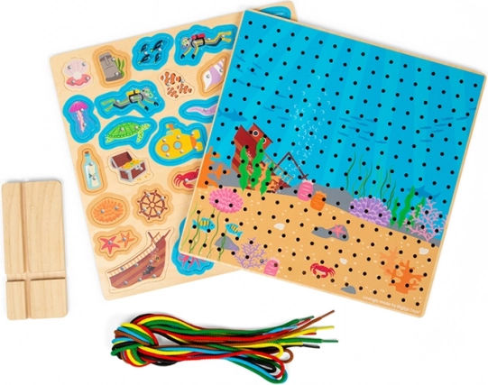 Ploča za provlačenje s podvodnim motivom idealna je edukativna igračka za djecu od 3 godine. Drvena perforirana ploča, šarene vezice i set morskih dijelova omogućuju djeci vježbanje prstića, mašte i koncentracije. Igra je intuitivna, a zahvaljujući čvrstoj konstrukciji od kvalitetnog drva odlično podnosi svakodnevnu upotrebu.
