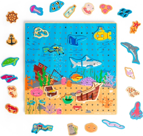 Set sadrži 30 dijelova i 6 šarenih vezica s kojima se može stvarati bezbroj scena – od ribica i ronioca do podmornice i potonulog broda. Materijali su odgovorno nabavljeni, a igračka udovoljava aktualnim europskim sigurnosnim normama.