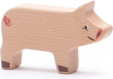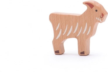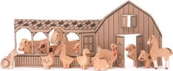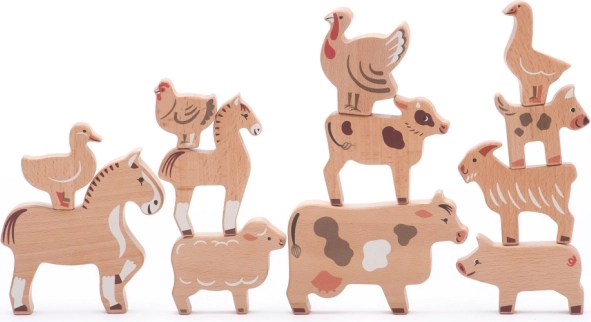 Ovaj kvalitetan set uključuje omiljene domaće životinje: konjića, ždrijebe, kozu, psića, prasence, tele, kravu, puricu, gusku, patku, kokoš, ovčicu, zeca i mačku. Zahvaljujući pažljivoj izradi od bukovine figure su ugodne na dodir, stabilne i idealne za svakodnevnu igru.