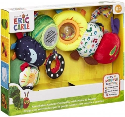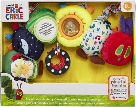 Omiljeni lik iz priče Vrlo gladna gusjenica oživljava kao šarena tekstilna plišana igračka puna aktivnosti, koja stimulira osjetila, podupire rani razvoj i vježba finu motoriku. Gusjenica se uvija, zvecka i reproducira uspavanku „Twinkle, Twinkle, Little Star“. Zahvaljujući različitim teksturama, zrcalcu, etiketama i priključnom prstenu zabavit će bebu kod kuće i na putu.