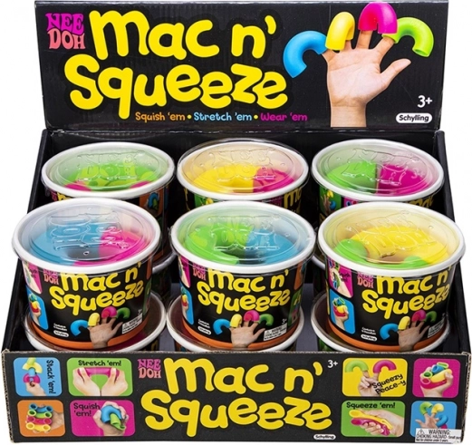 Zabavni antistresni makaroni NEE DOH MAC N' SQUEEZE donose četiri neonske cjevčice koje možete stiskati, rastezati, savijati i stavljati na prste. Zahvaljujući mekanom taktilnom materijalu pružaju brzo oslobađanje napetosti i osjetilnu stimulaciju, a s praktičnom čašicom idealni su za putovanja.