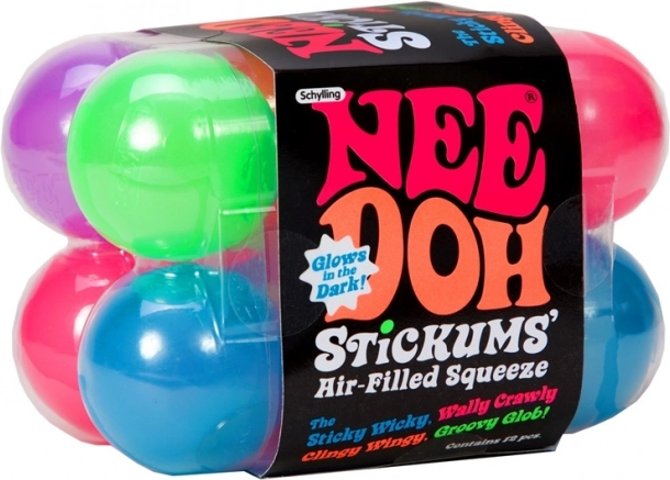 NeeDoh Stickums donosi spoj opuštanja i zabave u praktičnom pakiranju. Loptice imaju ugodno meku, ljepljivu površinu pa ih ne samo da možete stiskati, već ih i lijepiti te bacati na glatke površine – zidove, prozore ili stropove – i promatrati kako se polako odljepe i padnu.