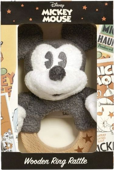Otkrijte idealnu prvu igračku za bebe: zvečkalo s ikoničnim MICKEY MOUSE na čvrstom bukovom prstenu s ukrasnim zvjezdicama. Zahvaljujući mekom plišu i glatkom drvu, sigurno je, ugodno na dodir i podupire rani razvoj vještina.