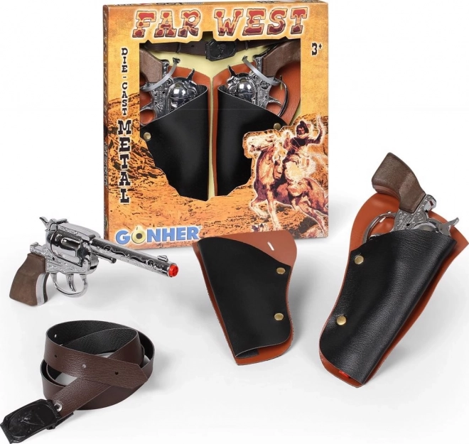 Kaubojski set Gonher savršen je dodatak za male pištolj-džije. Sadrži dva metalna revolvera s kapacitetom do 100 hitaca i praktičnu futrolu za pojas.