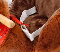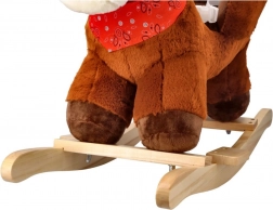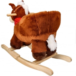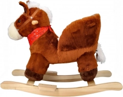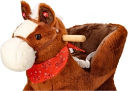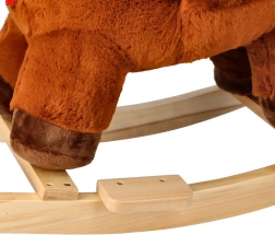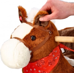 Ljuljački konjić ima meko smeđe tijelo, bijelu grivu i crvenu maramu, što mu daje realističan i prijateljski izgled.