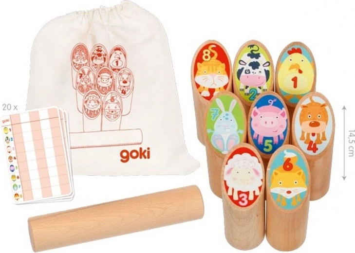 Dječja vikinška igra kubb sa životinjicama: 8 numeriranih kolaca, bacački kolac i pamučna vrećica. Treninira motoriku i preciznost, cilj igre je zbroj od 30 bodova.
