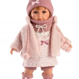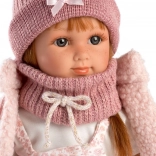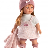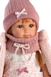 Lutka je obučena u cvjetnu haljinu, nadopunjenu pletenim šeširom i toplim čarapama, što stvara živahan i veseo izgled.