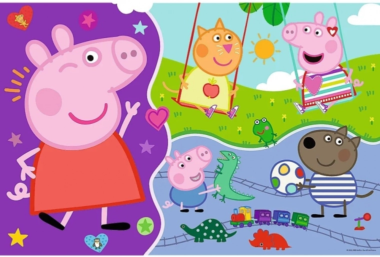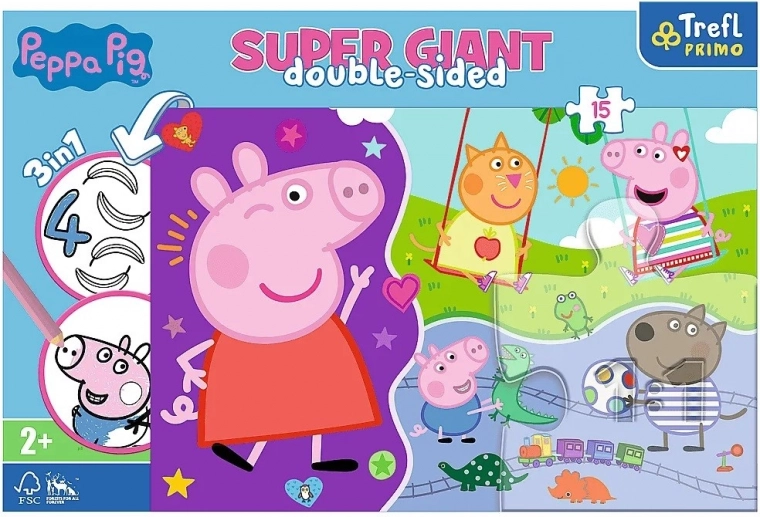 Ova ogromna slagalica s motivom Peppa Pig donosi djeci trostruku dozu zabave. Veliki, čvrsti dijelovi lako se hvataju malim rukama, a jednostavna, šarena grafika s velikim likovima motivira na ponovno slaganje. Stražnja strana dodatno skriva bojanku i jednostavnu igru s bojanjem, pa djeca vježbaju boje, koncentraciju i maštu.