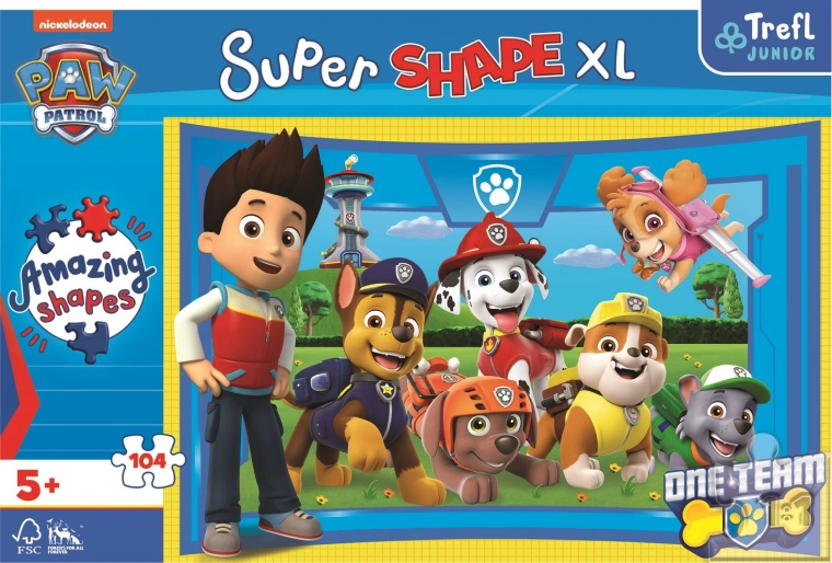Slagalica 104 dijelova XL Super Shape s motivom Paw Patrola. Veliki dijelovi, specijalni oblici, dimenzije 600 × 400 mm, idealno od 5 godina.