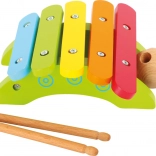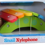 Ovaj šareni drveni ksilofon u obliku puža donosi djeci zabavne prve korake u svijet glazbe. Pet jasno obojenih metalnih lamela daje čiste tonove i potiče osjećaj za ritam te koordinaciju oko–ruka. Palice su pametno skrivene u “ticalima” i uvijek su pri ruci.