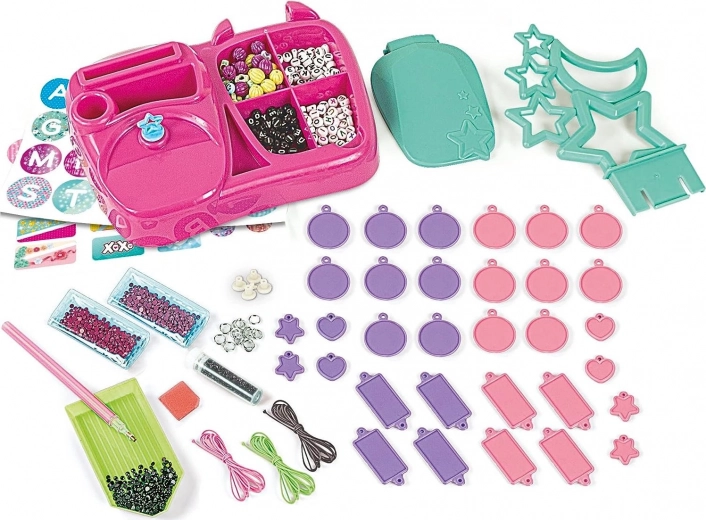 - Baza i držač za pribor s plastičnim poklopcem, perlice s 3 kompletne abecede, šarene ukrasne perlice, elastične uzice, šareni ukrasni privjesci, metalni prstenovi, sjajni prah, naljepnice za ukrašavanje, šareni kamenčići, olovka s voštanim vrhom za aplikaciju kamenčića, pladanj za kamenčiće, protuklizne nožice, slikovni priručnik