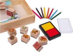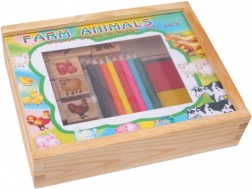 Ovaj set sadrži širok raspon pečata koji prikazuju različite životinjske stanovnike farme. Djeca mogu svaki motiv obojiti pomoću 8 priloženih bojica, što omogućuje beskonačne kombinacije šarenih dizajna. Drvena kutija pruža idealno skladišno rješenje za sve što djeca trebaju za izradu, a zbog toga je ovaj set također idealan za putovanja.