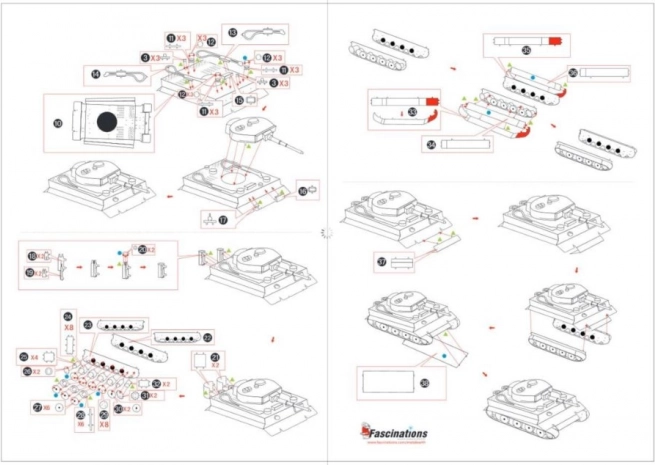Pojedine dijelove izvadite iz metalnih pločica; po potrebi upotrijebite male kliješta za rezanje (nisu uključena). Dijelovi se međusobno spajaju pomoću zapornih spojeva sastavljenih od kukice i otvora. Kukicu savijte pomoću malih tankih kliješta (nisu uključena) i postupno spojite sve spojeve dok ne nastane vrlo realističan majstorski primjerak!