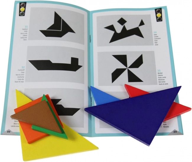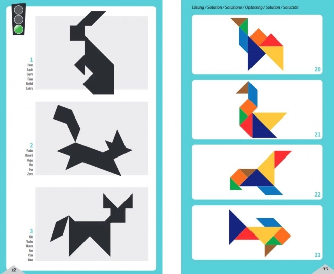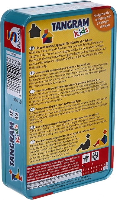 Ovaj dječji tangram u limenoj kutiji donosi zabavan put od prvih jednostavnih oblika do razrađenih silueta životinja i likova. Zahvaljujući trima razinama težine djeca postupno grade sigurnost i radost uspjeha. Ako je zadatak prezahtjevan, dijelovi se mogu slagati izravno prema priloženom rješenju.