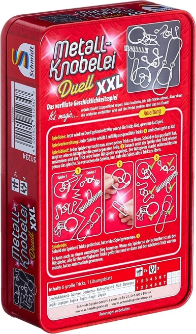 SCHMIDT predstavlja sjajan set metalnih zagonetki Duell XXL, osmišljen za ljubitelje logičkih zagonetki i strateškog razmišljanja. Svaka od šest zagonetki sastoji se od dva dijela, a vaš je zadatak pronaći način kako ih bez upotrebe sile razdvojiti, a zatim ponovno sastaviti u izvorni oblik. Zagonetke dolaze u stilskoj limenoj kutijici koja osigurava njihovo sigurno čuvanje i jednostavnu prenosivost.